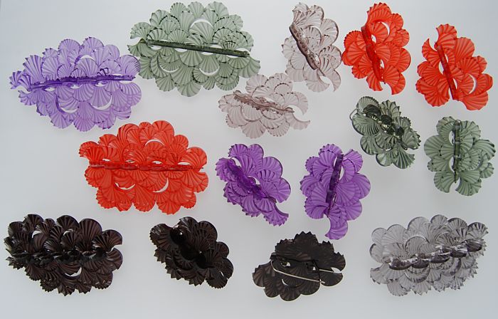 Grey/orange/yellow/red, . Red/3x pinks. Grey/3x greens/teal, all 34mm long, 27mm wide