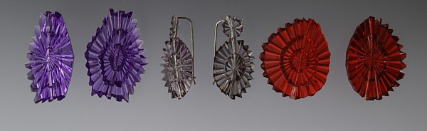 Kath Inglis is a material-based maker who transforms seemingly ordinary Polyvinyl Chloride (PVC) sheet plastic into vividly coloured and intricately detailed wearable objects. Eschewing expensive gemstones and metals in favour of prosaic PCV, Inglis uses a variety of hand driven techniques to transform sleek clear PVC into highly textured surfaces that glitter with a play of light and reflection. In her highly innovative practice, Inglis manipulates flexible PVC sheet through the simple processes of hand dyeing, cutting, carving and adding layers/components through heat fusing to elevate a mundane material into the precious.