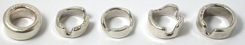 "Molten silver metal is poured into a hole in a tree trunk. Each ring comes out