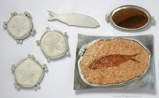 1. Sea Biscuit brooch, sterling silver, fossil, $350