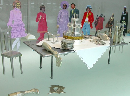 1 Handbag $25 27 People $25 ea 1 Vase $30 8 Flowers $10 ea 1 Stool $25 2 Chairs $30 ea 1 Table & cloth $40 12 Plates $10 ea 6 Bottles $10 ea 12 Cutlery $15 pr 5 Glasses $10 ea 1 Rug $10 1 Doilies $10 1 Lamp $50 5 Streamers $50 ea 8 Rings $70 ea 1 Cake & stand $270 1 Puddle $5 For the Guggenheim, $1,800 set